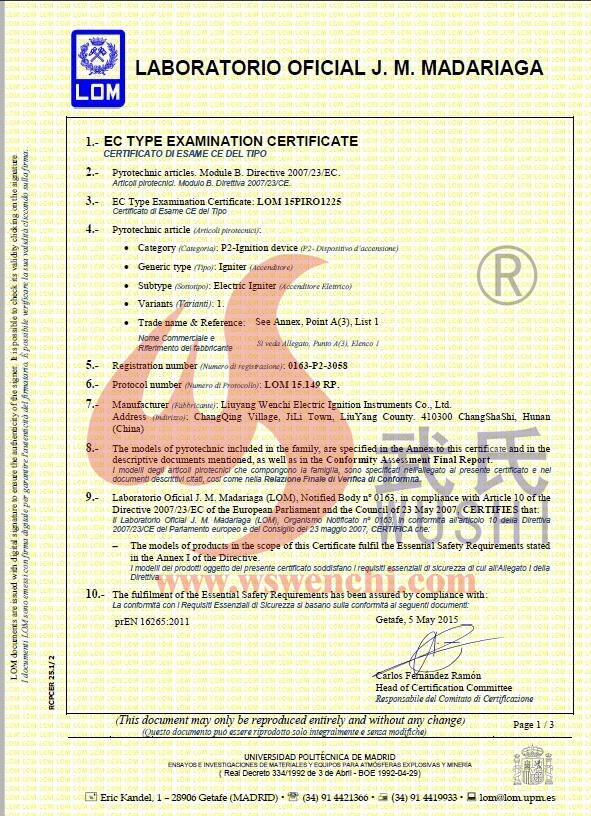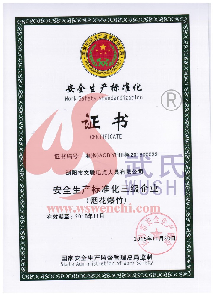 瀏陽市文馳電點火具有限公司(原培文電子點火器材廠),創(chuàng)建于1998年,是一家專業(yè)從事研制銷售電子點火產品的民營科技企業(yè),是我國第1枚煙花用電點火頭生產者,是《煙花爆竹電點火頭國標》牽頭起草單位。公司位于中國“煙花之鄉”湖南省瀏陽市,地理位置優(yōu)越,交通便利。 我公司研制的對象是用電能引燃火藥、做機械功等預定功能的一次性使用的元件或裝置,包括電點火頭(英文名ElectricMatch or Electric Igniter,中文俗稱“電火柴”或“電發(fā)火頭”)、電點火管和延期電點火管;我們估且在以后的產品技術欄中將我們研究的產品統稱為電點火具,將電點火器看成是用于提供和控制供給電點火元件點火的電能器材;我們研究的電點火橋路有橋絲式、無橋絲···